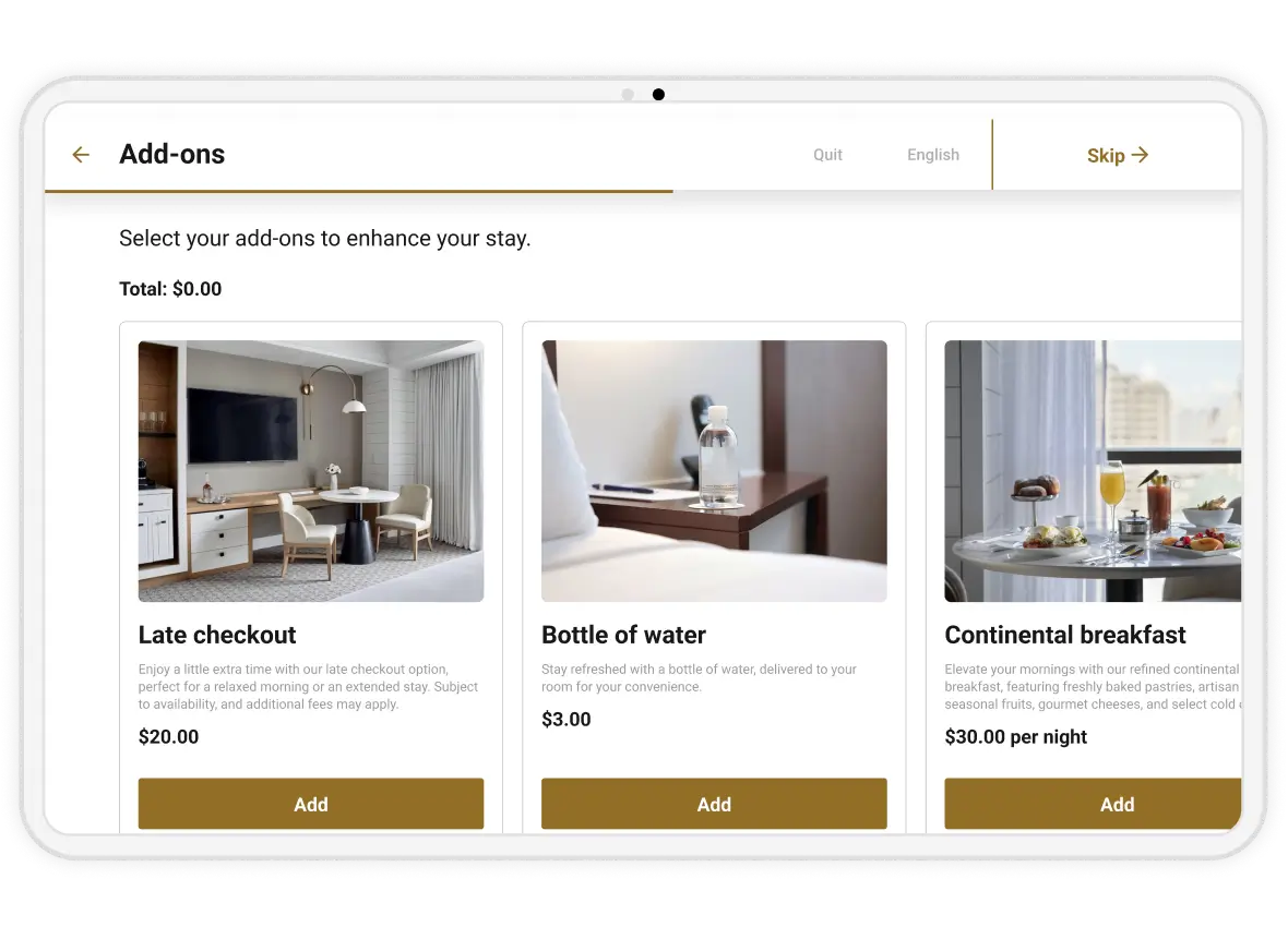 Increase revenue without the extra effort. Present guests with relevant upgrades and add-ons through the check-in interface via your lobby kiosk.